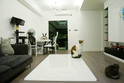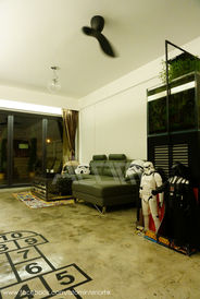 設計風格以工業風為主屋主熱情招代朋友,另一方面需要一個寧靜舒適的家居。設計劃分兩個區域來迎合屋主,屋內底層採用工業風元素,泥水地面配合黑色傢俱加上復古 裝飾,令客廳增添一份藝術氣息;而上層客廳用上簡約黑白灰設計,線條簡潔,寧靜舒適,與下層風格產生強烈對比,使屋主的兩者喜好得以平衡