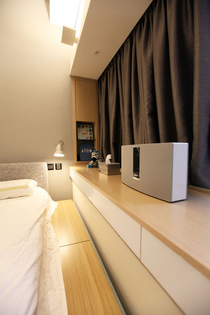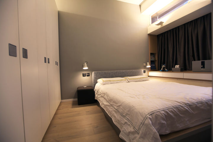 設計用上簡約概念為主,以淺色木紋及淺色作為主調,配上條子作點綴。富予空間清雅悠閒的感覺
